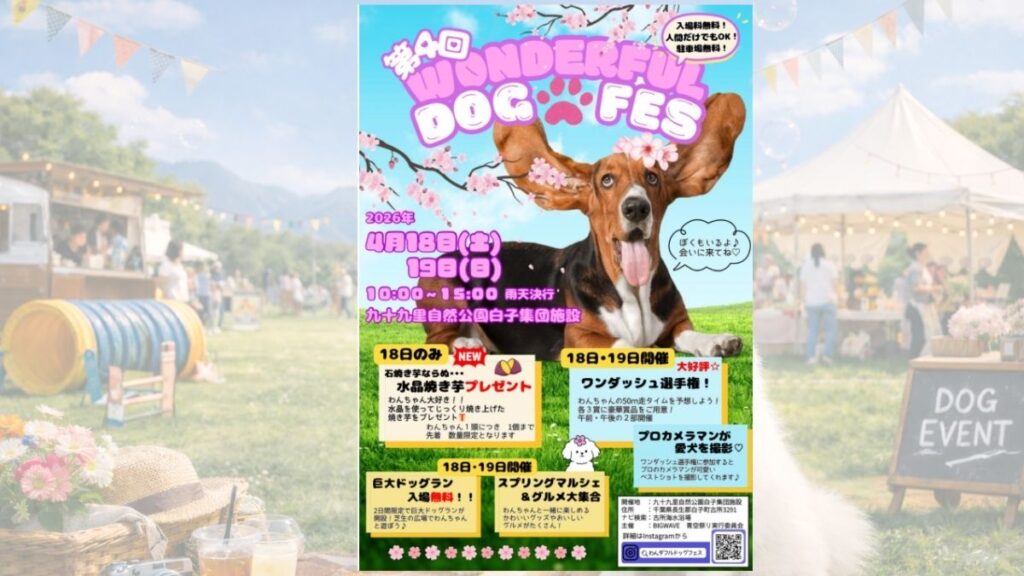 九十九里の広大な芝生広場で開催される2日間のドッグイベント。テーマは「桜」。マルシェ・ワークショップ・各種体験コンテンツと盛りだくさんの内容。